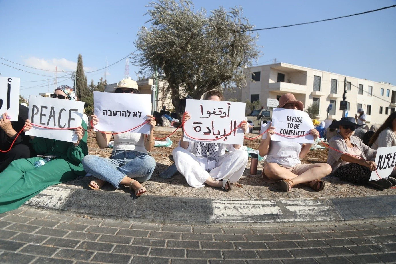 ”I dag var vi 70 israelske og palestinske kvinner fra hele landet – Tel Aviv, Jerusalem, Nablus, Hebron, Jordandalen, Ramallah, Betlehem og mange andre steder – som kom sammen i en sittestille-aksjon for å få slutt på krigen, okkupasjonen og folkemordet i Gaza. Vi holdt et rødt bånd som symboliserer blodsutgytelsen. Det binder oss sammen og virker uendelig, men vi vet at vi kan og må bryte denne sirkelen.